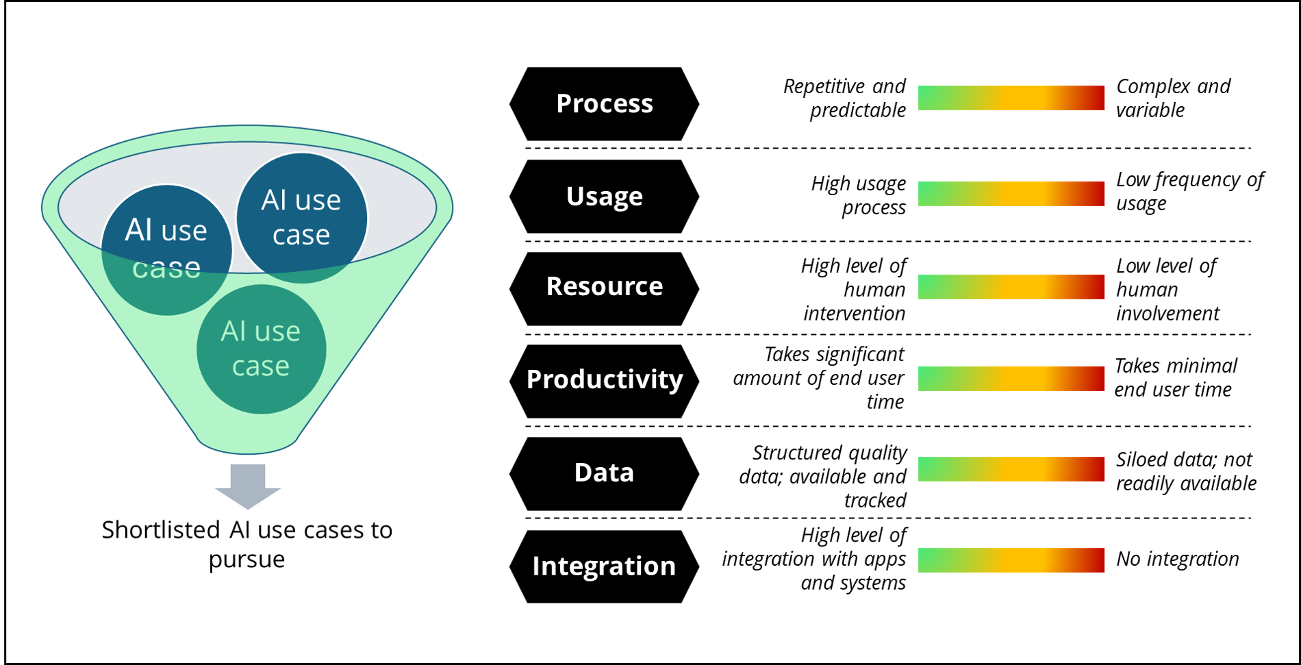 Identifying opportunity areas for AI agents is one of the most critical steps in the successful adoption of AI. Once identified, the prime candidates should be evaluated based on the complexity of the process, frequency of usage, availability of data, number of resources involved in the process, impact on end user productivity and experience, and opportunity for integrations within workflows.